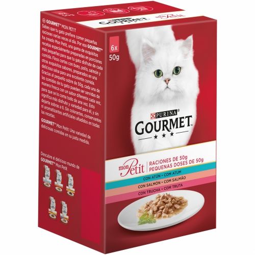 GOURMET Mon Petit es una gama de exquisitas recetas de GOURMET especialmente desarrolladas para que tu gato disfrute de una amplia variedad de sabores en su justa medida: finos cortes con carnes o pescados preparados en una deliciosa salsa para una excelente comida. GOURMET Mon Petit está presentado en un pequeño sobre de 50g, por lo que cada una de las comidas de tu gato pueden ser servidas de manera fresca para que se lo coma todo de una vez, lo que significa más disfrute y variedad para él, y sin dejarte sobras.